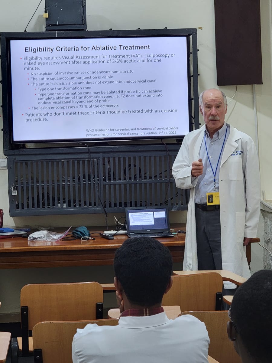 The World Health Organization, in 2018 called for the elimination of cervical cancer, defined as no more than 4 cases per 100,000 women. In Rwanda in 2020, the incidence rate was 28.2, seven times the target rate and 4.5 times the rate in the U.S.A. The mortality rate from cervical cancer is almost 10 times that seen in the U.S. A principal reason for the disparity in rates of this largely preventable cancer is that in spite of a robust HPV immunization program, Rwanda lacks a screening program to diagnose and treat cervical cancer's easily treated precursor lesions. The University of Rwanda in conjunction with several U.S. Universities and NGOs has worked over the past 2 years to establish such a program. While the rudiments of this program are slowly falling into place at the main teaching hospital in Kigali. I will be joining a group of women's health providers training Rwandan ob/gyn residents and nurses to screen for cervical cancer screening using HPV testing and visual inspection with acetic acid (VIA) and to treat identified lesions with LEEP and thermal ablation, effective outpatient therapies. I will be working mostly in outlying district hospitals. My team will also focus on local nurses and public health professionals to establish a culture of screening within the community.