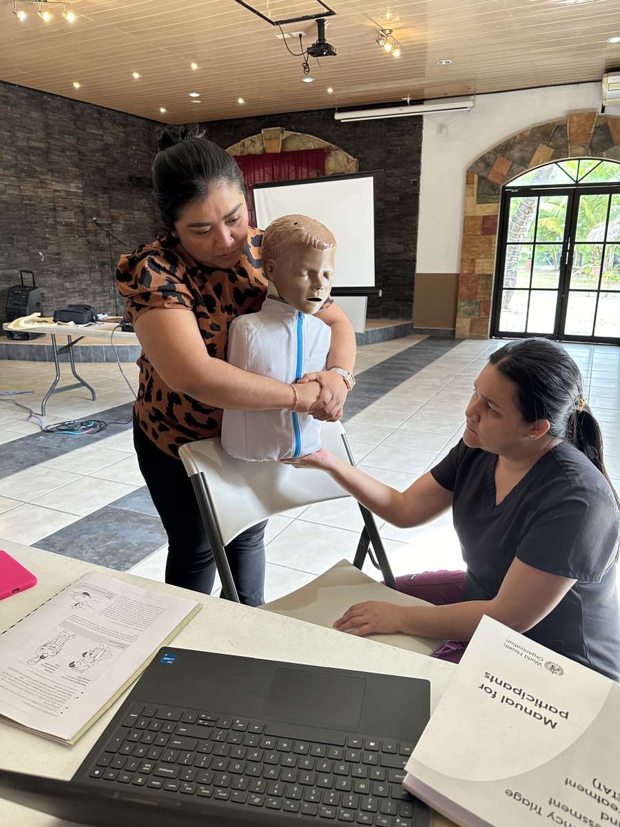 Baylor College of Medicine (BCM) and Texas Children's Hospital (TCH) have partnered with the Ministry of Health and Wellness (MOHW) and Karl Heusner Memorial Hospital Authority (KHMH) in Belize since 2015 offering continuing medical education training to nursing and physician staffing focused on pediatric emergencies. The World Health Organization (WHO)’s Emergency Triage Assessment and Treatment (ETAT) is a 2-day, evidenced-based course that teaches pediatric assessment, triage and initial management to healthcare workers (HCWs) in resource-limited settings and includes a 1-hour basic introductory module for support staff. ETAT-based training triage systems paired with training of HCWs have improved pediatric outcomes worldwide. Belize, with an under 5 mortality rate of 1.1%, trained 387 HCWs in ETAT from 2016-2020. After a pause during the Covid pandemic, training resumed in 2022 utilizing a staged regional model of training-of-trainers (ToT). Since 2022, an additional 250 HCWs have been trained in ETAT in a phased manner from region to region. This will be the first training of trainers for the Northern Region.