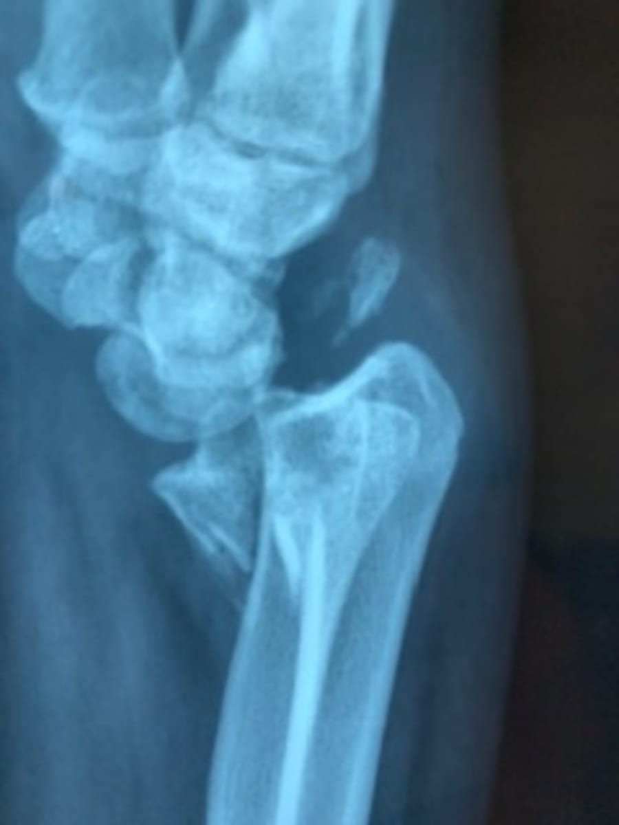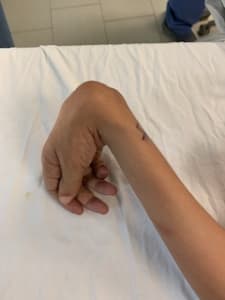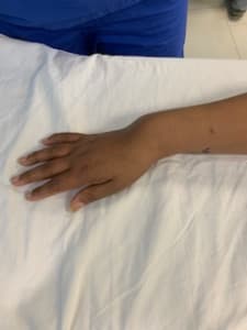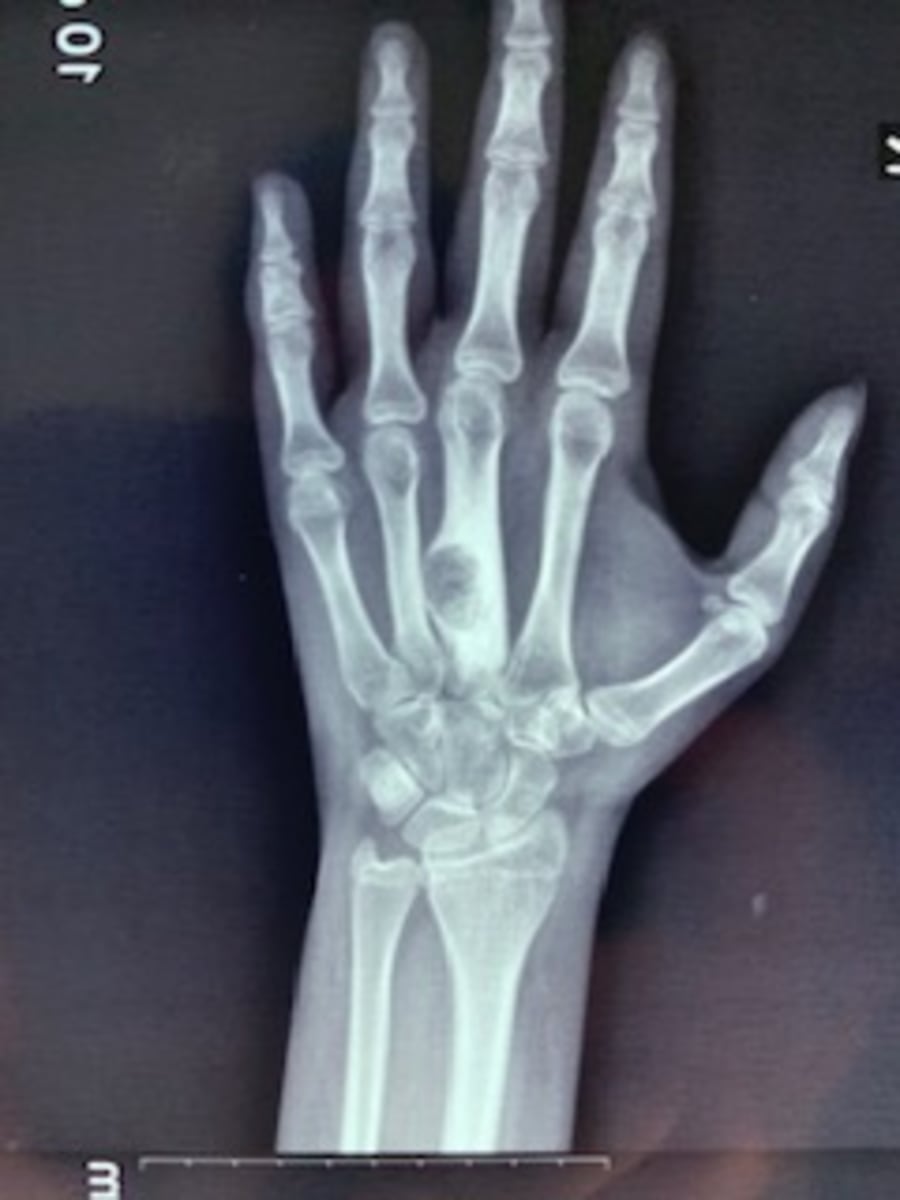 A few examples of the patients and conditions we treated are now presented. Images 2-4 are of an 8 year old boy with symbrachydactyly. He required syndactyly release of the first web space and z-plasty of the small finger. Images 5-6 are of a patient with a severe wrist flexion contracture due to longstanding neuromuscular disorder. Image 6 is an intraoperative photo of his fused wrist. Images 7-8 are of a patient with a benign bone tumor. Images 9-11 demonstrate treatment of a patient with a distal radius fracture. In the US, this would be fairly easily treated with early open reduction and internal fixation. This fracture was made more challenging in that it was eight months old. On rare occasions, we are also able to treat acute fractures.