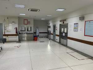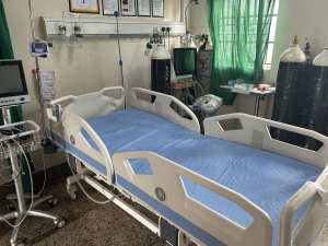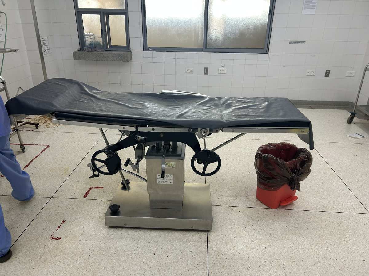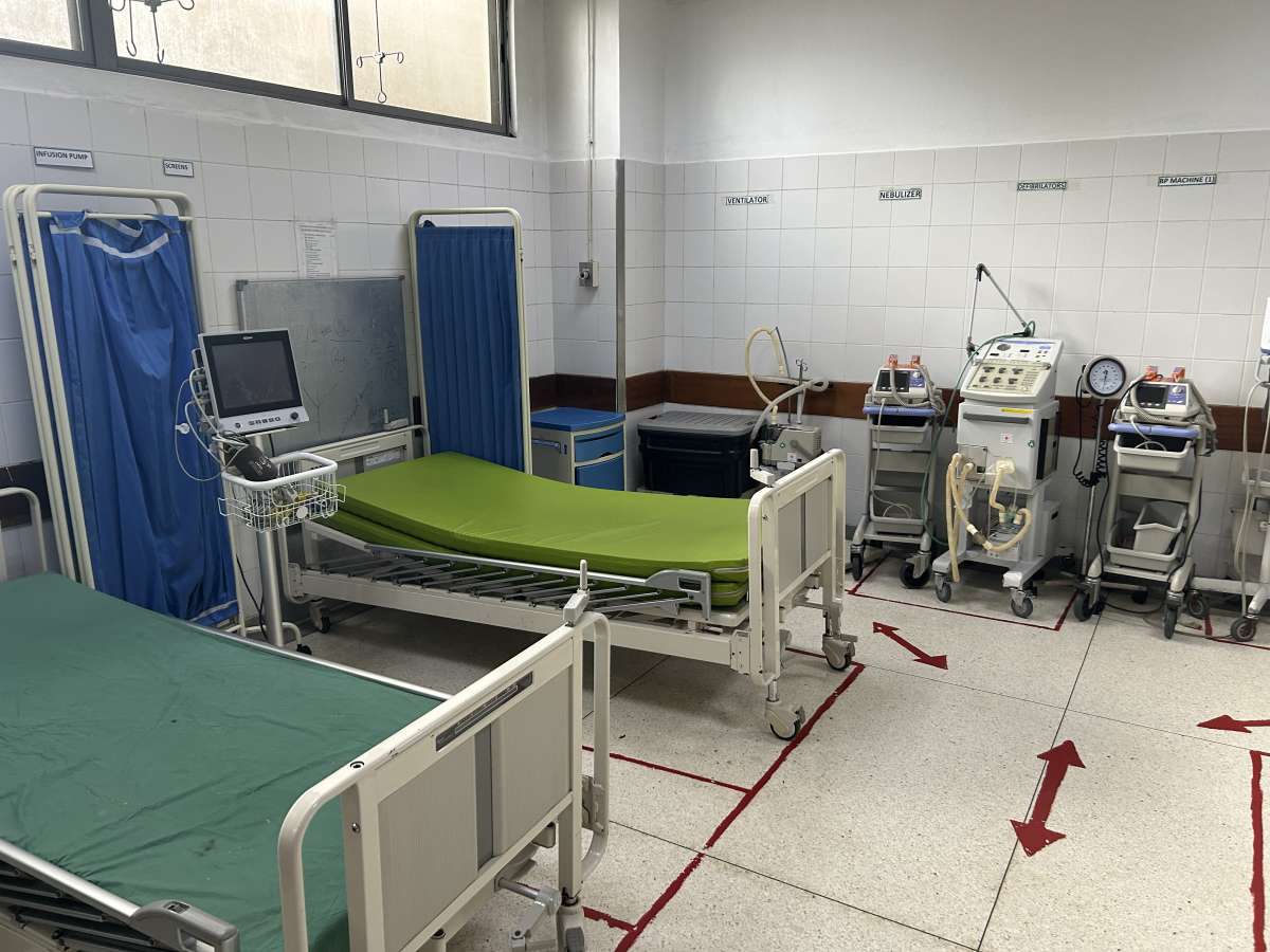 The ICU itself is located downhill in a tin-roofed building. It contains four beds, four oxygen cylinders, and one ventilator. No mobile X-ray exists; patients cannot be moved for imaging. Gurneys must be physically lifted over grass and steep slopes to access the building. ICU care is managed by anesthesia and nursing trainees.