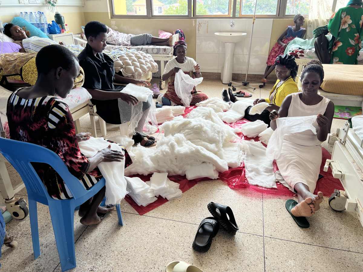 Patients on the ward, folding bandages