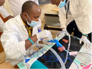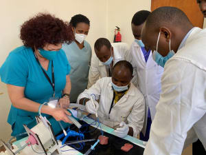 The day after we arrived and cleared quarantine (upon arrival, you are tested again for covid-19 and then confined to your hotel room until the results come back negative about 12 hours later), training sessions were set up at the University Simulation Center. During Monday and Tuesday of both of the workweeks, the WHH volunteers gave lectures and demonstrations, and the residents practiced in small groups with us during hands-on sessions. (The large resident class was divided so that about half of them could continue their work in the hospital while the rest attended our training course. The second week, they switched.) The residents and some of the faculty members enjoyed the opportunity to work with the new equipment and practice some of their new skills.